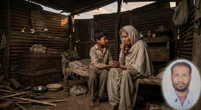 ایک کہنہ رسیدہ جھونپڑا۔۔۔ جابجا آسمان نظر آتے زنگ آلود پترے۔۔۔ جن پر سکھانے کی غرض سے رکھی ہوئی لکڑیاں اور گنّے کی پھانس۔ دو پرانی صندوقیں۔۔۔ مڑے تڑے جرمن کے چند ڈبّے۔۔۔ ایک خمیدہ چارپائی۔۔۔ ایک چوبی صندوق۔۔۔ ایک ٹوٹا مٹکا اور ایک بیٹا۔۔۔ کل ملا کر یہی اس کا سرمایہ ہے۔